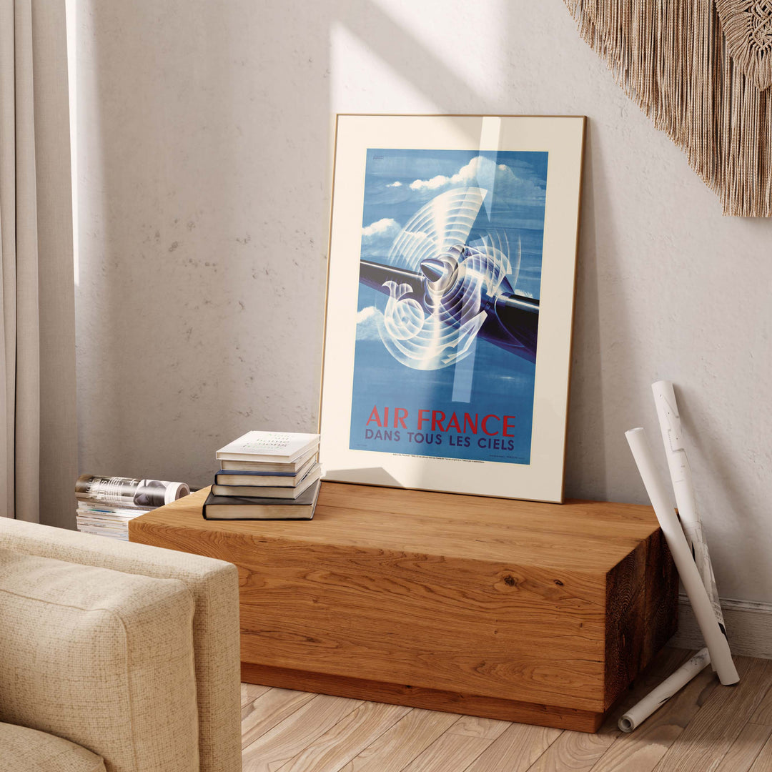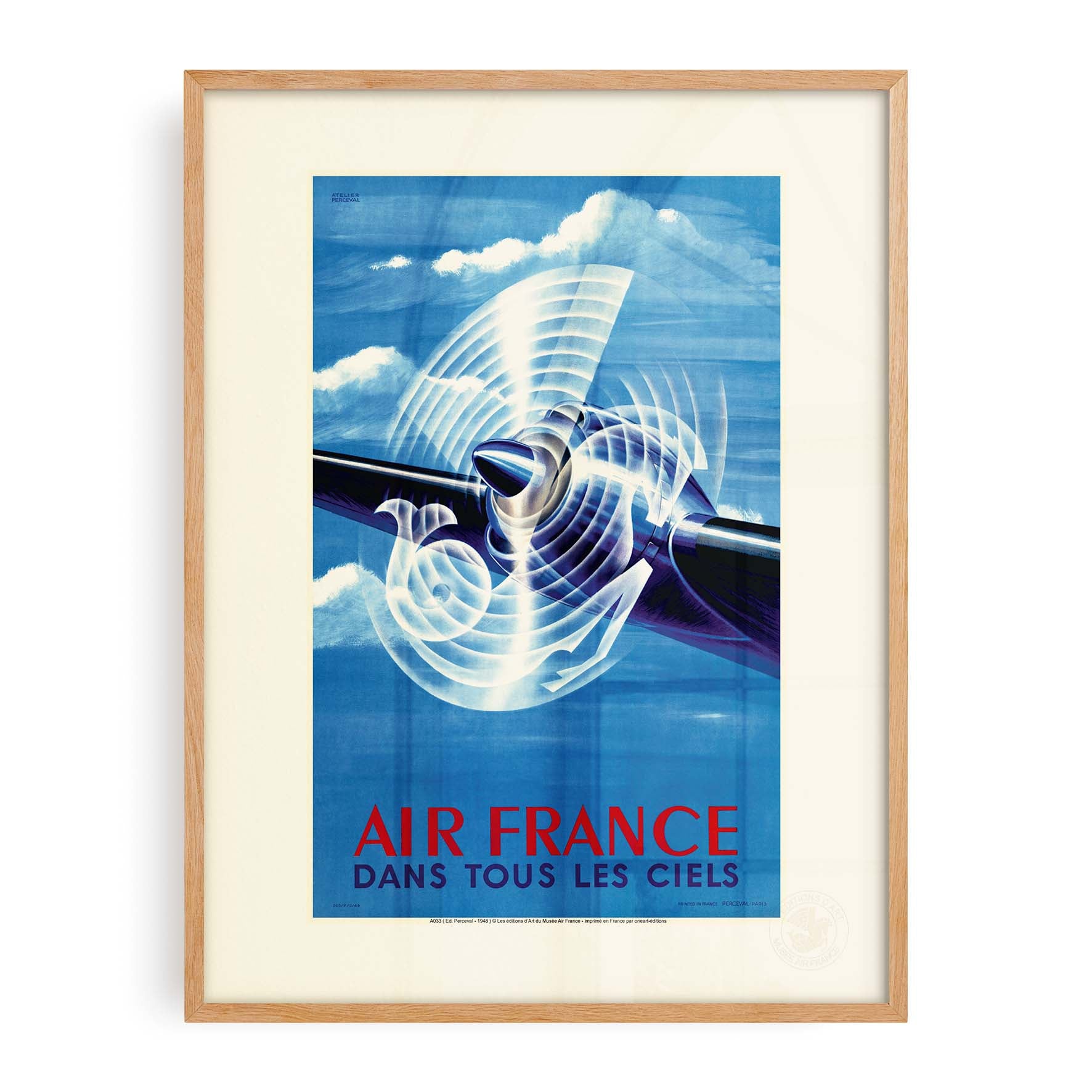 Illustrée dans les années 50, cette affiche dynamique capture la puissance et la vitesse de l’aviation avec un gros plan sur une hélice en mouvement. Son design épuré en bleu et blanc symbolise la modernité et l’envergure mondiale d’Air France, parfait pour une décoration rétro et aérienne.